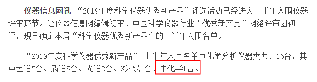 “2019年度科學儀器優(yōu)秀新產(chǎn)品”評選活動于2019年8月16日公布了入圍名單,通過儀器信息網(wǎng)編輯和中國科學儀器行業(yè)“優(yōu)秀新產(chǎn)品”網(wǎng)絡評審團初評,上半年入圍名單中化學分析儀器類共計16臺,上海禾工ALT-1工業(yè)在線過程滴定儀是其中唯一入圍的電化學分析設備。